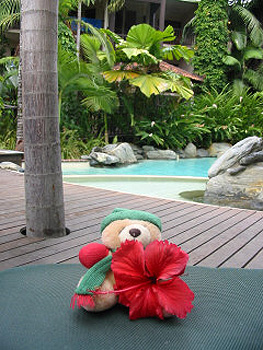 Craig took Harvey and I to Far North Queensland for the first time in 2002. Lazing by the pool in the tropics... But Harvey insists on wearing his gloves, scarf and beanie!